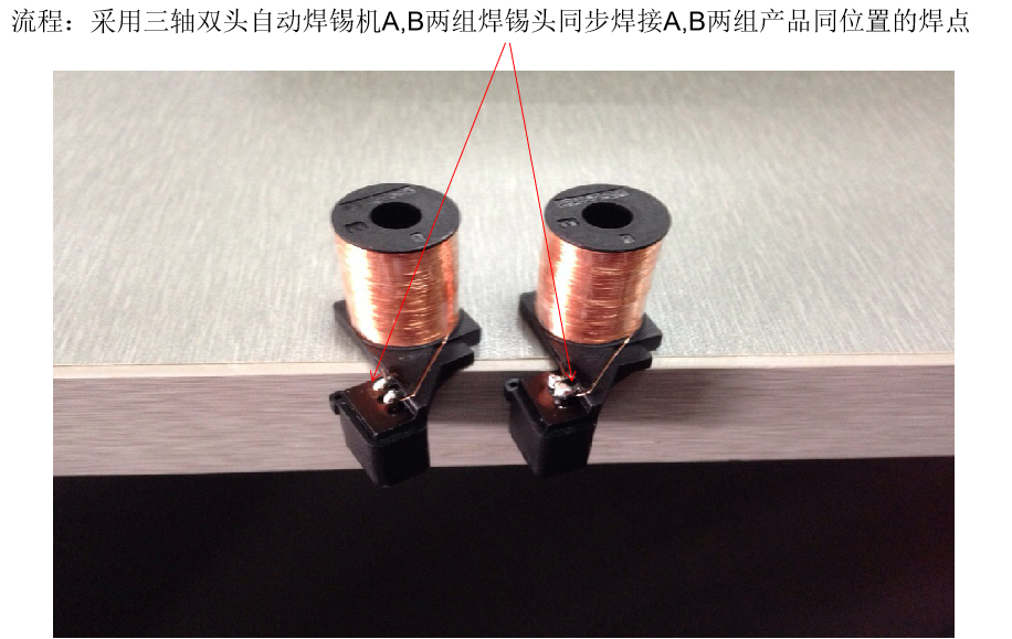 一個(gè)產(chǎn)品共計(jì)2個(gè)焊點(diǎn)保供,分為A&B兩組產(chǎn)品。由同一設(shè)備的A&B兩組焊錫頭對(duì)應(yīng)A,B兩組產(chǎn)品同位置的焊點(diǎn)配合同時(shí)工作協同控製;
